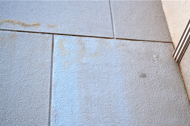色褪せは、外壁が紫外線によって劣化し、新築時の色が褪せてきてしまった症状です。4,5年で色褪せに気づくことも多いです。水をかけた際に、色が濃くなる場合は色褪せがかなり進行しています。
